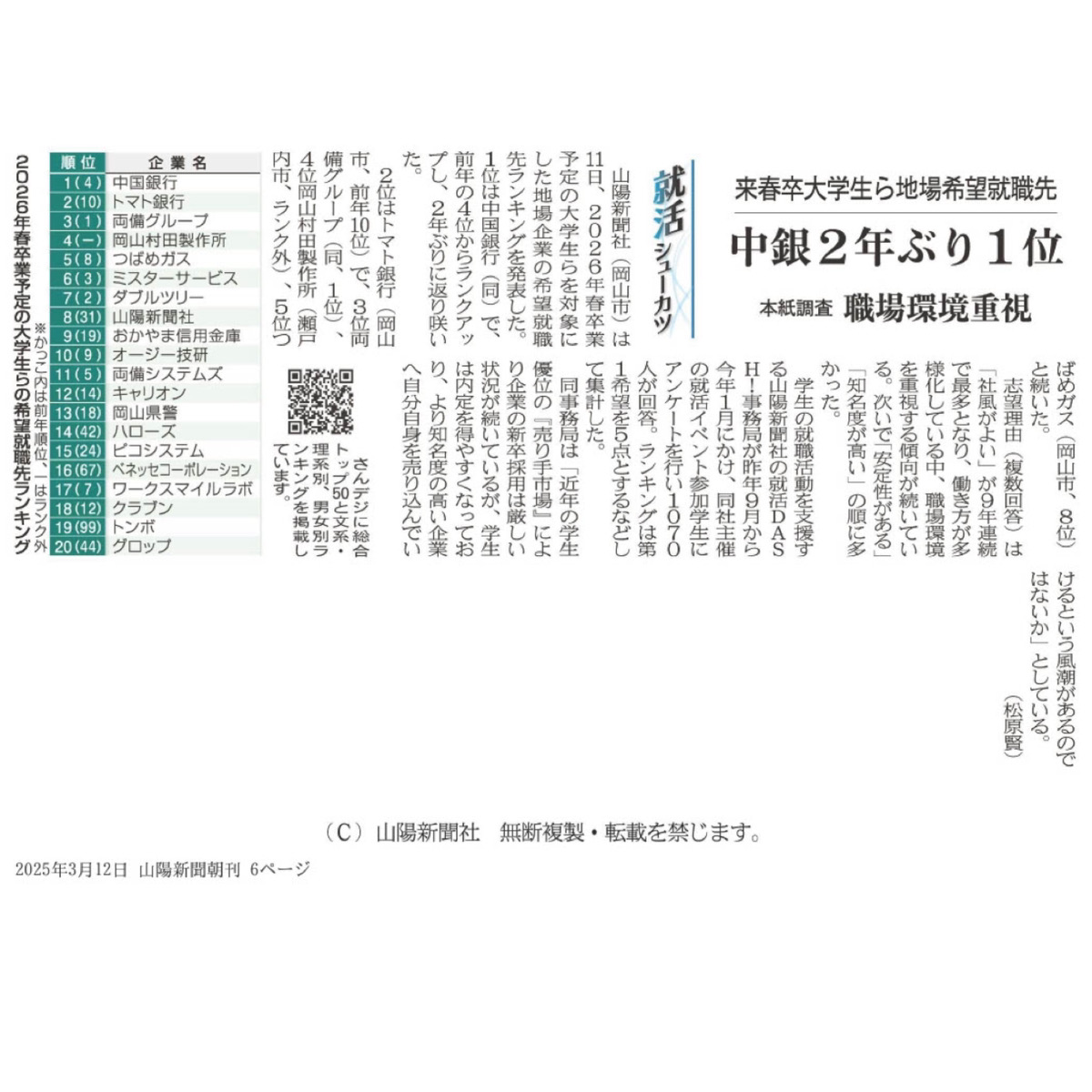 2026年岡山県就職人気企業ランキングで7位に選ばれました。
