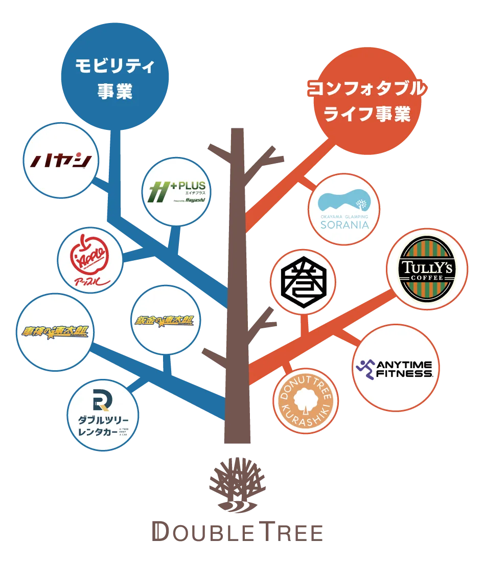 そして2023年、さらなる挑戦と事業拡大を見据え、社名を「株式会社ダブルツリー」へと改め、新たな一歩を踏み出しました。これまで培ってきたモビリティ事業をさらに進化させるとともに、地域の暮らし全体を支える総合的なサービスを展開してまいります。